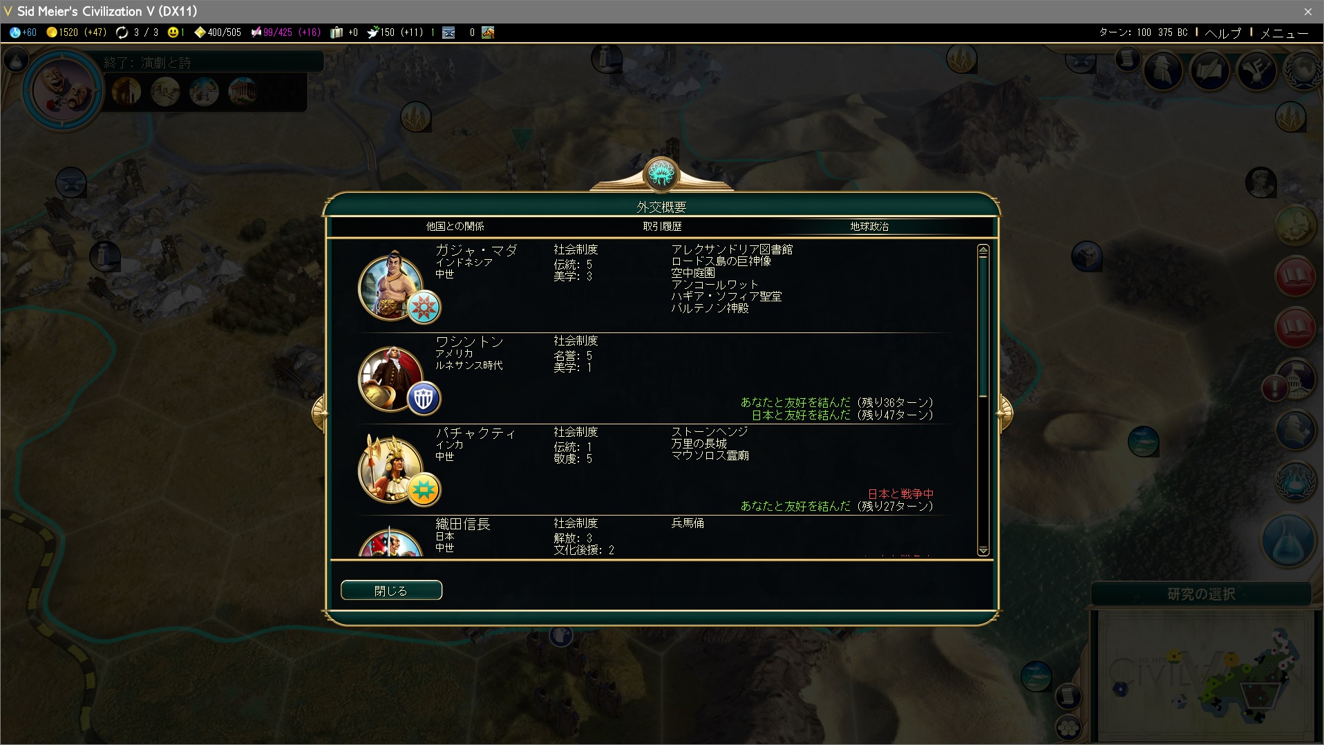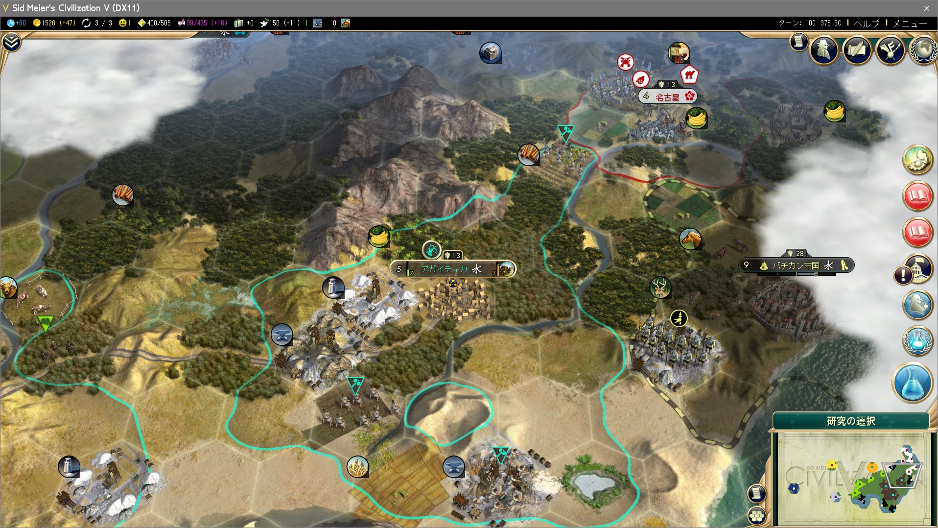 現在、4文明と研究協定。そろそろビーカーが入る頃なので、研究予約(Shift予約)を忘れずに。研究協定のビーカーが変なとこに流れると技術窃盗のスケジュールが大きく狂ってしまう。