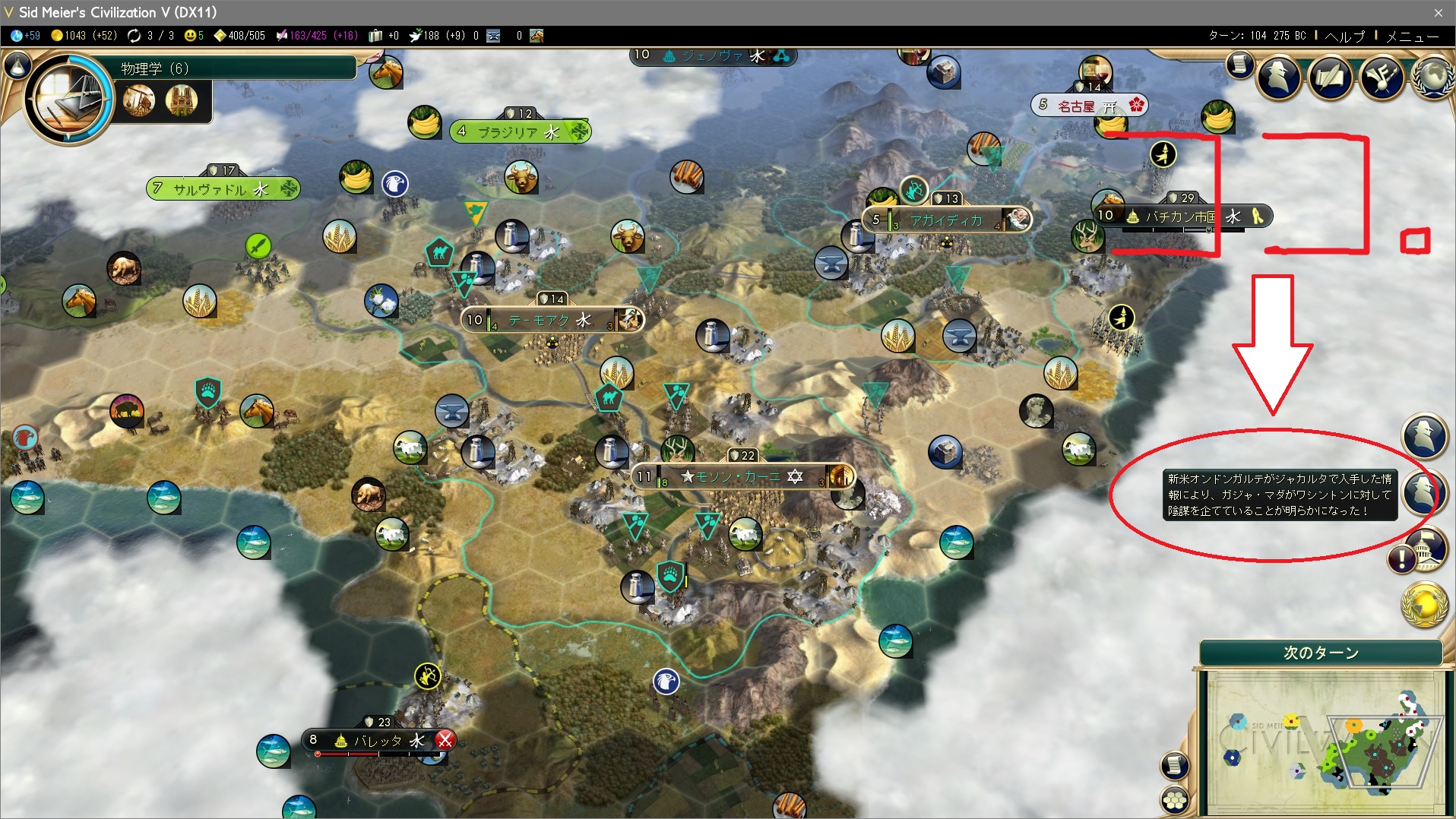 「~が~に対して陰謀を企てていることが明らかになった!」というポップアップ。初心者は陰謀って何さ?と疑問に思っていただろう。陰謀とはスパイを他文明に潜伏させていることだ。