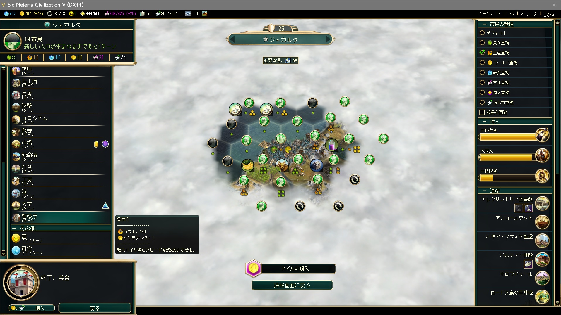 ターン115、テクノロジー奪取まであと7ターン。研究は、物理学→機械(途中まで)。