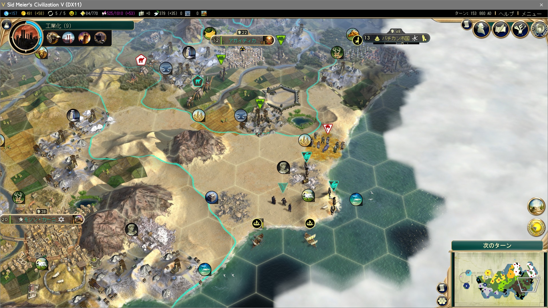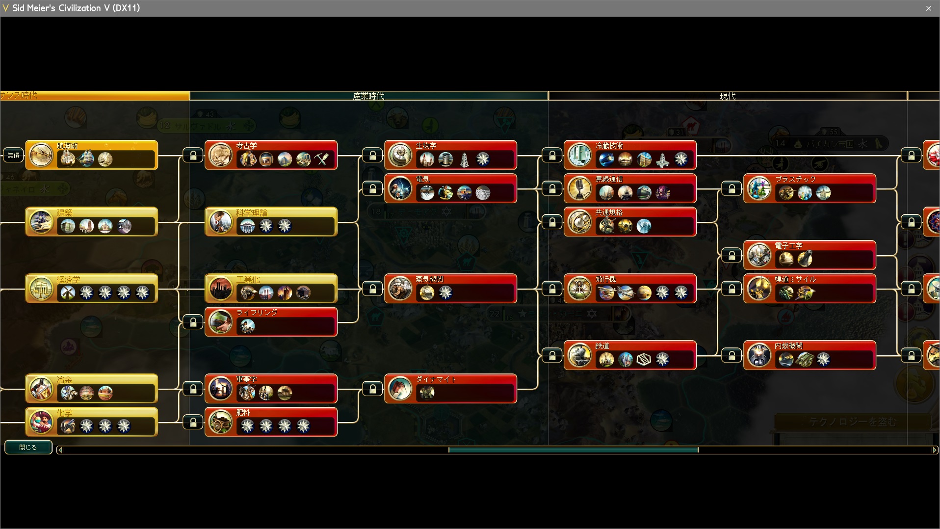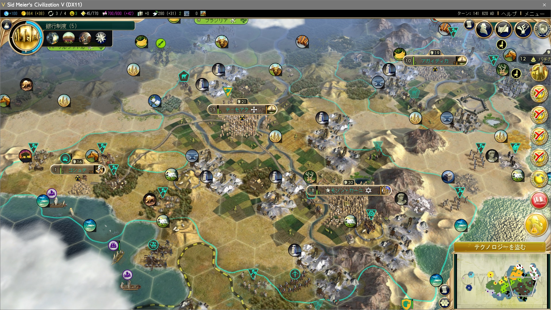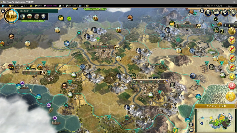 ターン141、テクノロジー奪取まであと17ターン。研究は、銀行制度→経済学→工業化(途中まで)。スパイ効率とかどうでもいいから、思想採用を急ぐ。