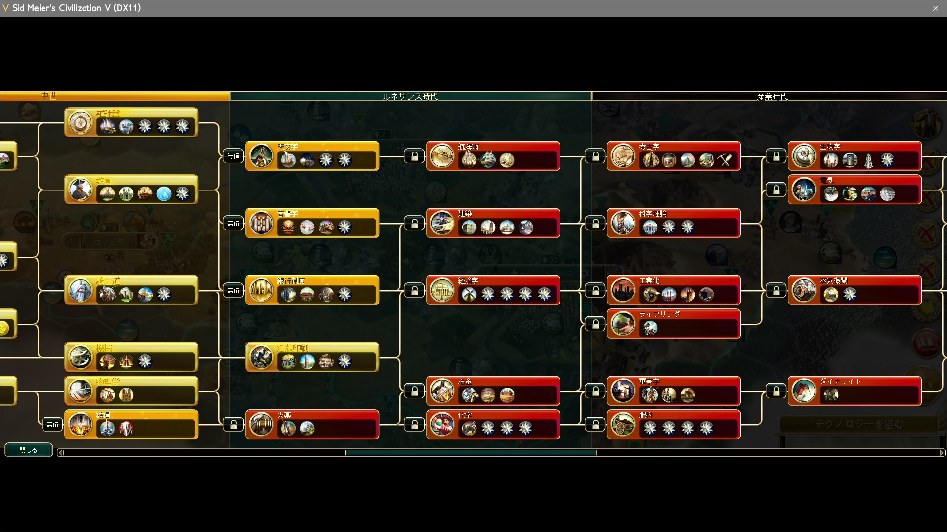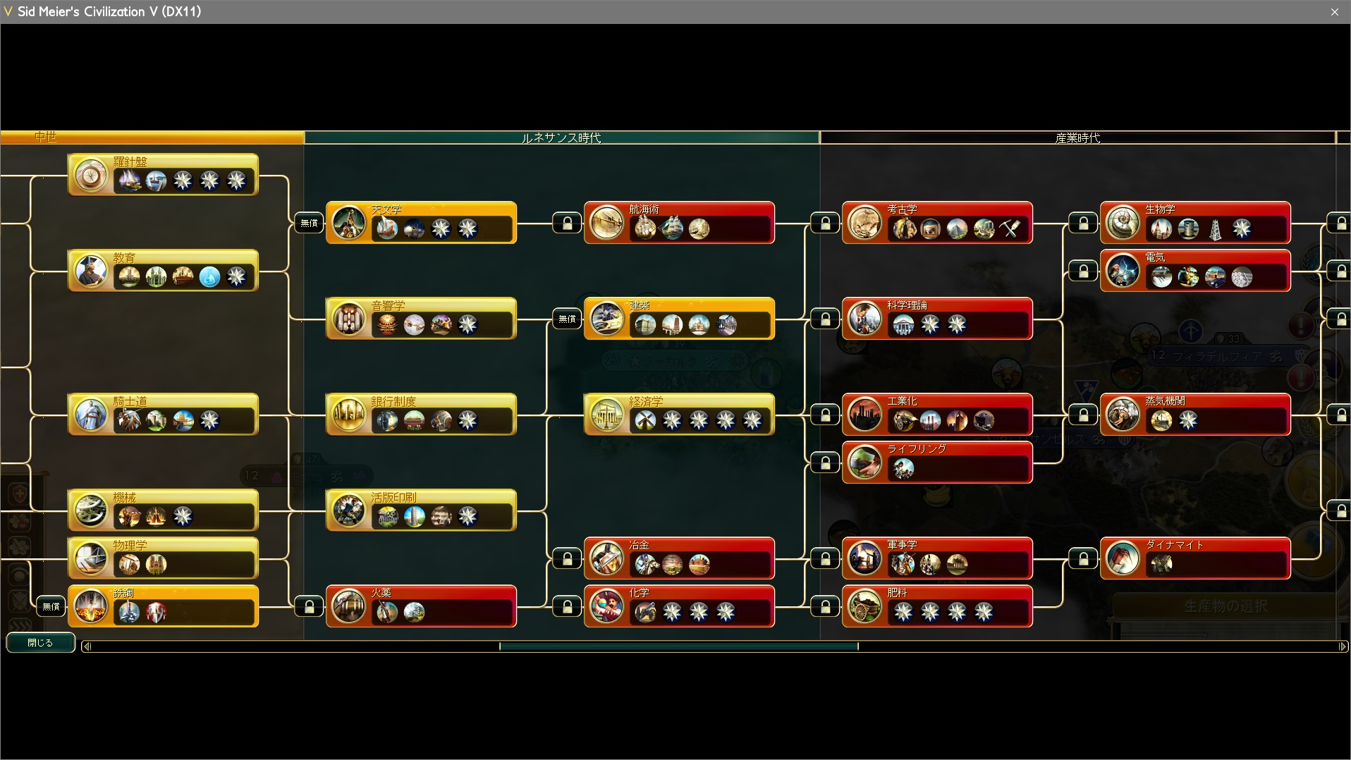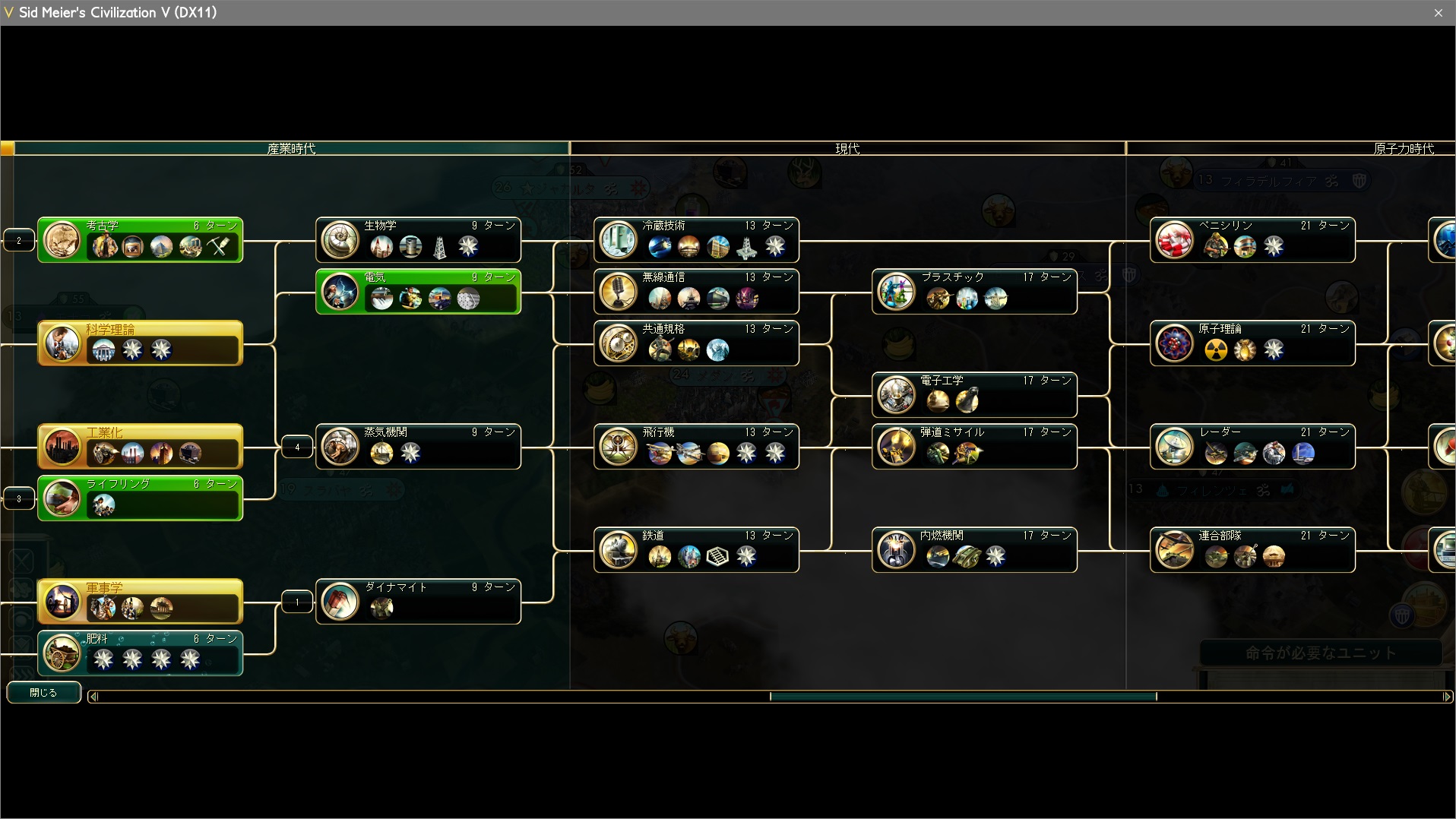ターン141、テクノロジー奪取まであと17ターン。研究は、銀行制度→経済学→工業化(途中まで)。スパイ効率とかどうでもいいから、思想採用を急ぐ。