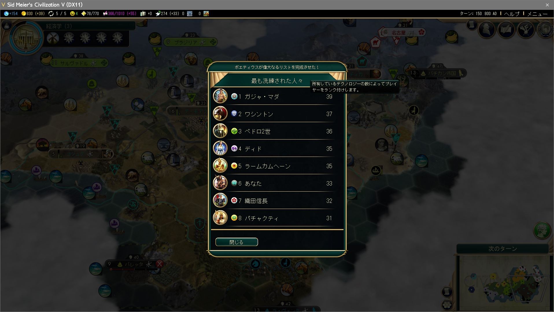 都合よく全文明のテクノロジー数が判明。偉大なるリストから有益な情報が得られることは少ないが、思わぬ発見があったり。
