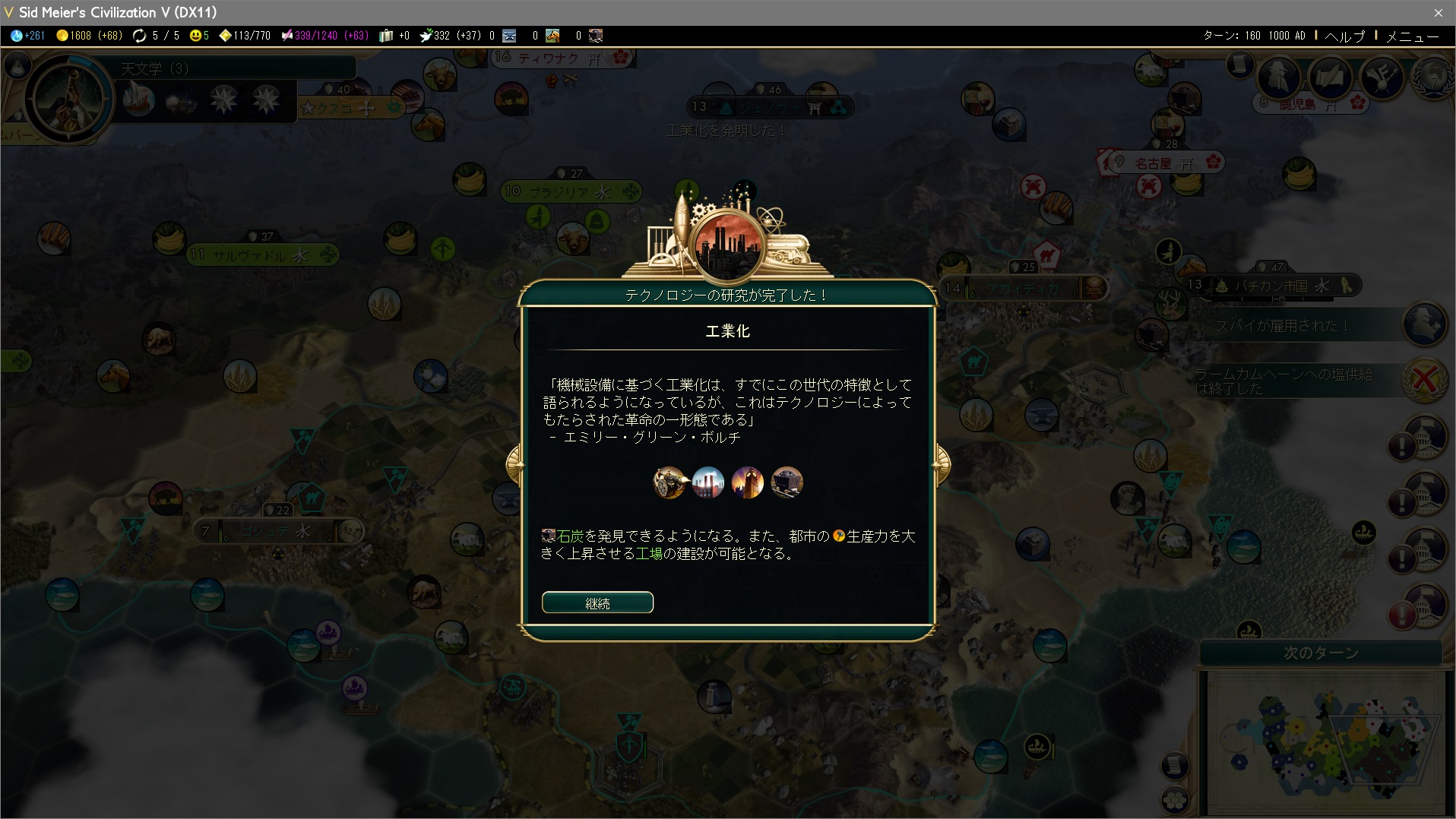 ターン160、工業化の研究完了で産業時代入り。2人目のスパイ獲得。難易度や目指す勝利に関係なく、産業時代入りのテクノロジーは工業化であるべき。
