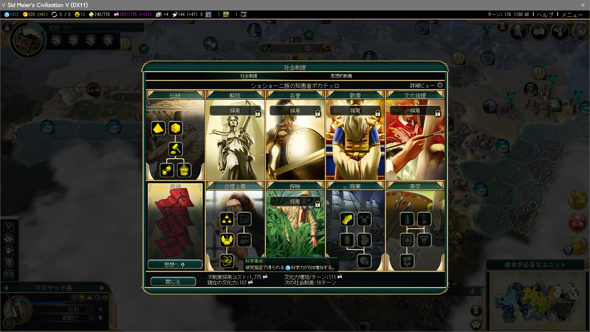 ターン177、テクノロジー奪取まであと16ターンと24ターン。研究は、軍事学→肥料→ダイナマイト。