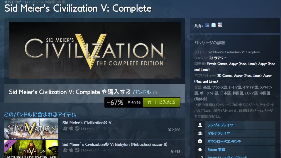 んで拡張パック全部入りのComplete Edition。間違って拡張パックなしのを買っちゃう人がいるから、ちゃんとComplete Editionを買おうな。